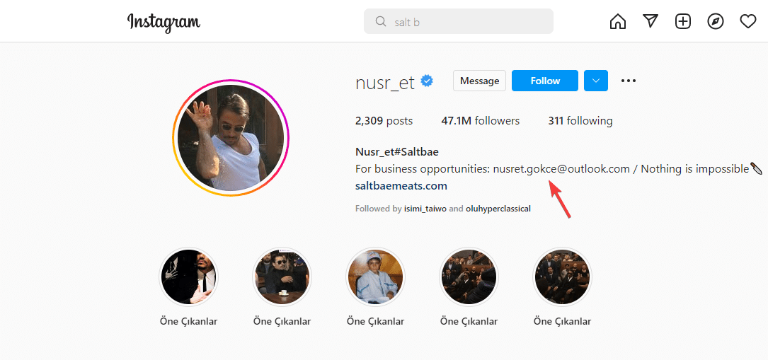 Often, most influencers on Instagram leave their email contact on their bio. Take, for example, Saltbae. His email contact is clearly displayed on his bio.