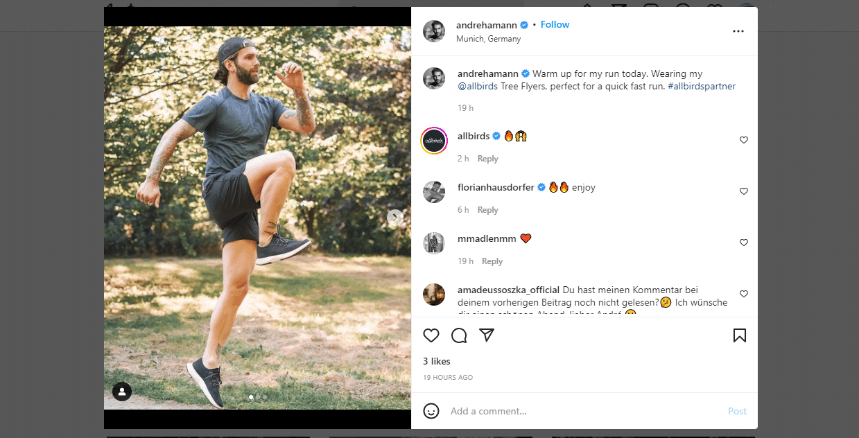 Doing a shoutout for your brand by yourself doesn’t always work. Sometimes, it’s best to leave it to those with more influence on Instagram. And that’s exactly what All Birds, a footwear brand, chose to do by getting Andre Hamann to do a shoutout.