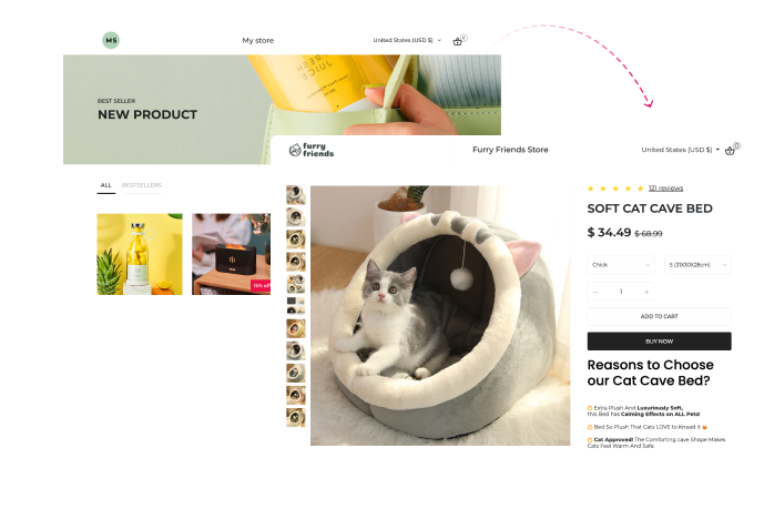 Create a high-converting store in just minutes, built for dropshipping from the ground up and with free hosting included. You can even use a custom domain.