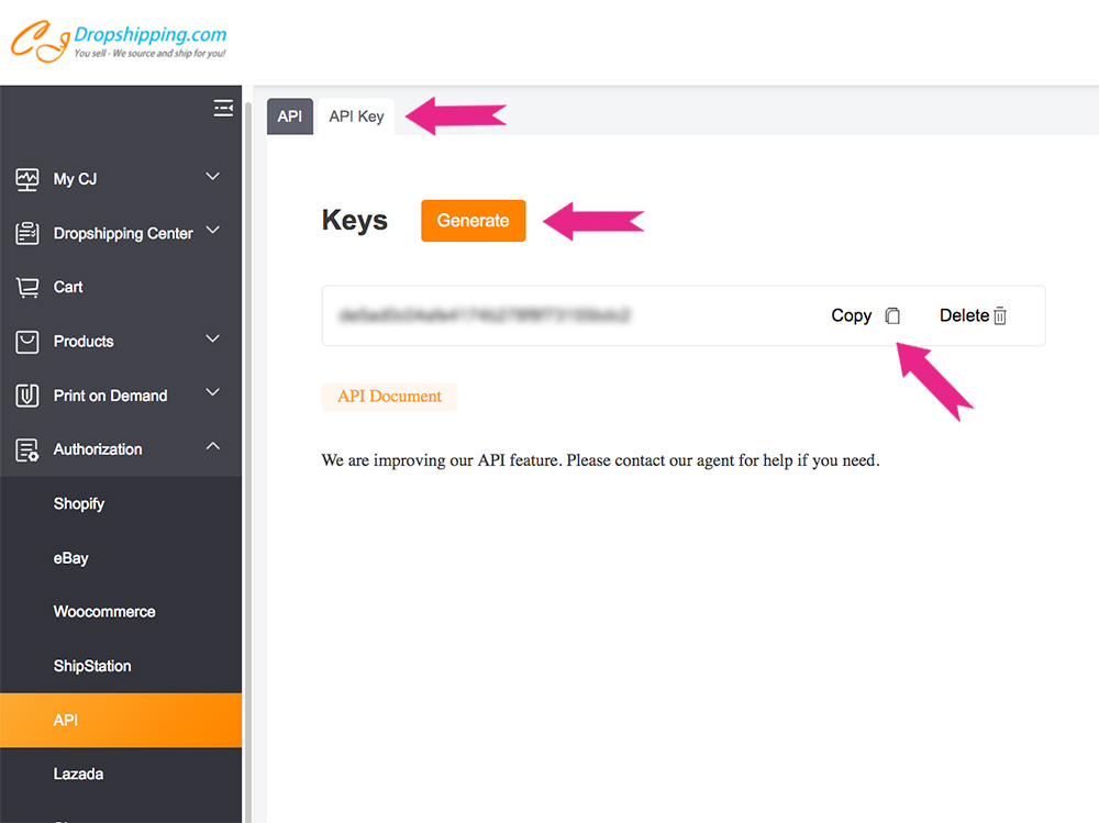 After logging in, Go to Authorization > API > API Key, then click Generate to create your own API Key, and then click Copy