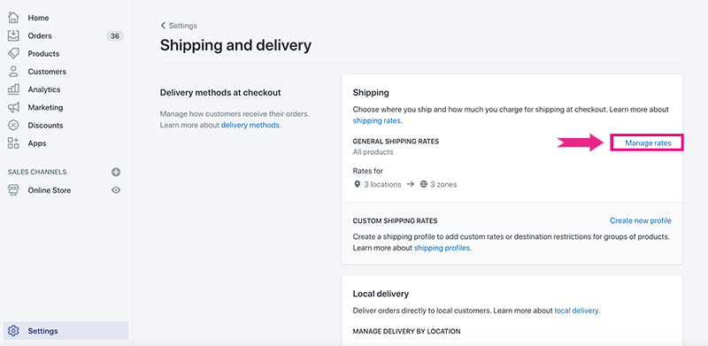 2. At the top of the Shipping and Delivery page, click the Manage Rates button found in the upper right hand corner of the General Shipping Rates section.