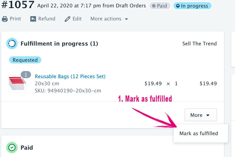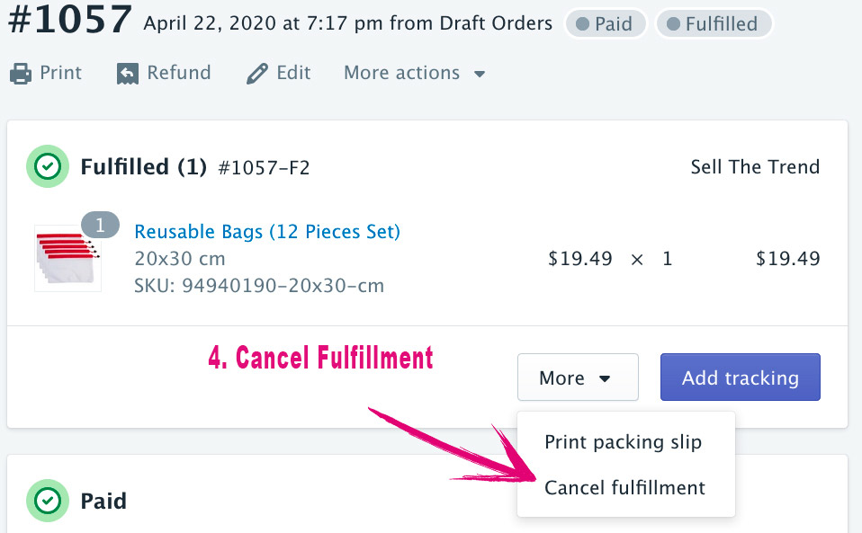 Below is the process to re-set your Order from within Shopify in the event you had pressed "Request Fulfillment" or have auto-fulfill order setup within your Shopify Settings. All fulfillment should be handled from within Sell The Trend My Orders Page. If you see orders appear fulfilled when you have not actually pressed "Order product" and launched the fulfillment process, then you can use this process to undo that "auto-fulfillment".