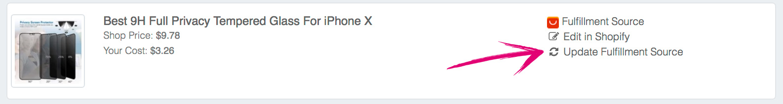 1. Go to My Stores > Products and locate the product you would like to update suppliers for. You can use the search to locate it by name and then click Update Fulfillment Source