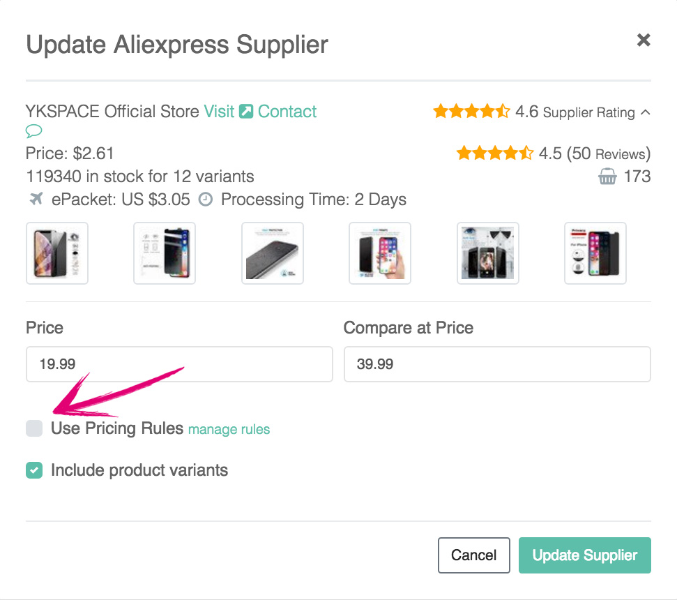 3. Once the new supplier information loads up, enter the product pricing (what you want to sell the product for) or you can choose to click on "Use Pricing Rules" so that each variation will get priced based on the variation price multiplied by the price multipliers entered into the Settings (Automation) area.