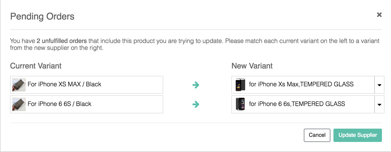 For every variation on the left make sure to match an appropriate variation on the right from the new supplier. as you can see in the example below, we located a supplier selling similar variations of this product so that we can match the same type of iPhone cases between the two suppliers. Click Update Supplier and you are done! You would now be able to fulfill any pending orders with this new supplier.