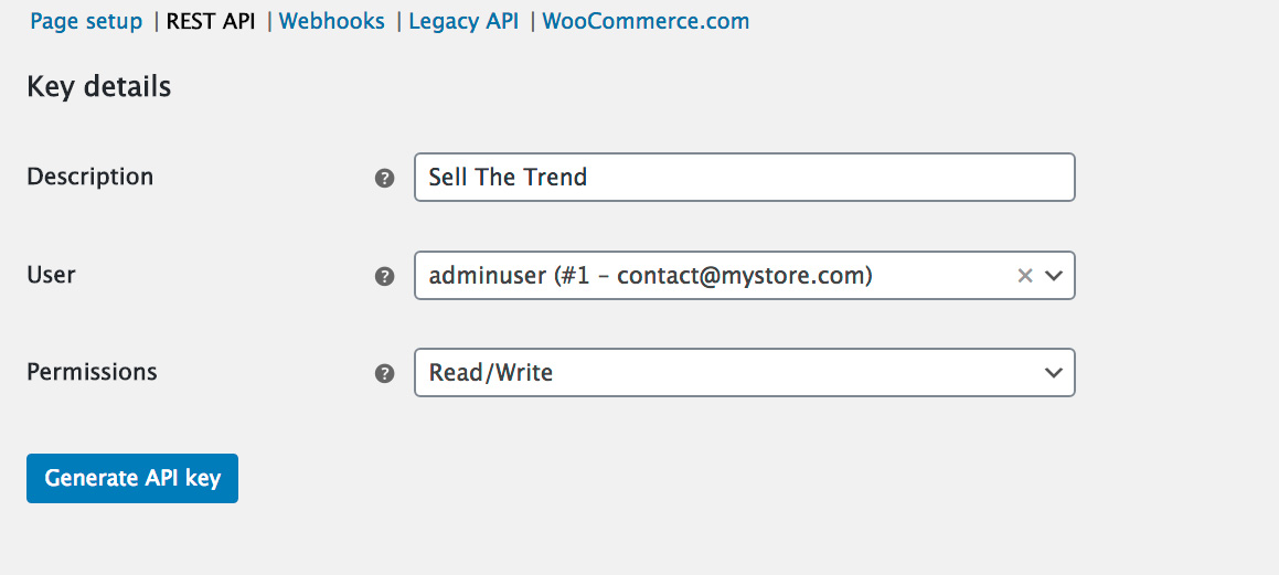 In the Description, type in "Sell The Trend." Make sure the user selected in the USE input box is an admin level user. Change the permissions to Read/Write. Press the Generate API key button. Here you will see your consumer key and secret. This allows Sell The Trend to connect to your store.