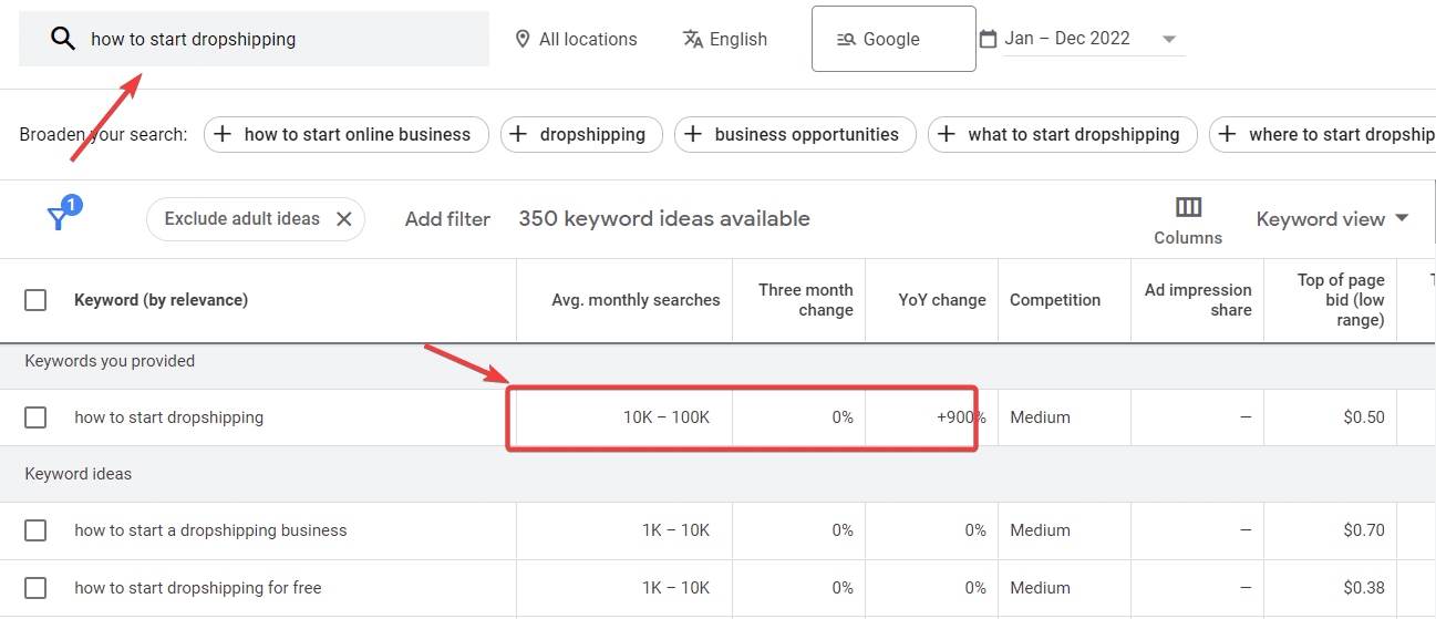 Care to know why? A lot of people are getting into dropshipping every day. We took a sneak peek into Google Keyword Planner and discovered that there are about 10k to 100k monthly searches for the keyword “how to start dropshipping”.
