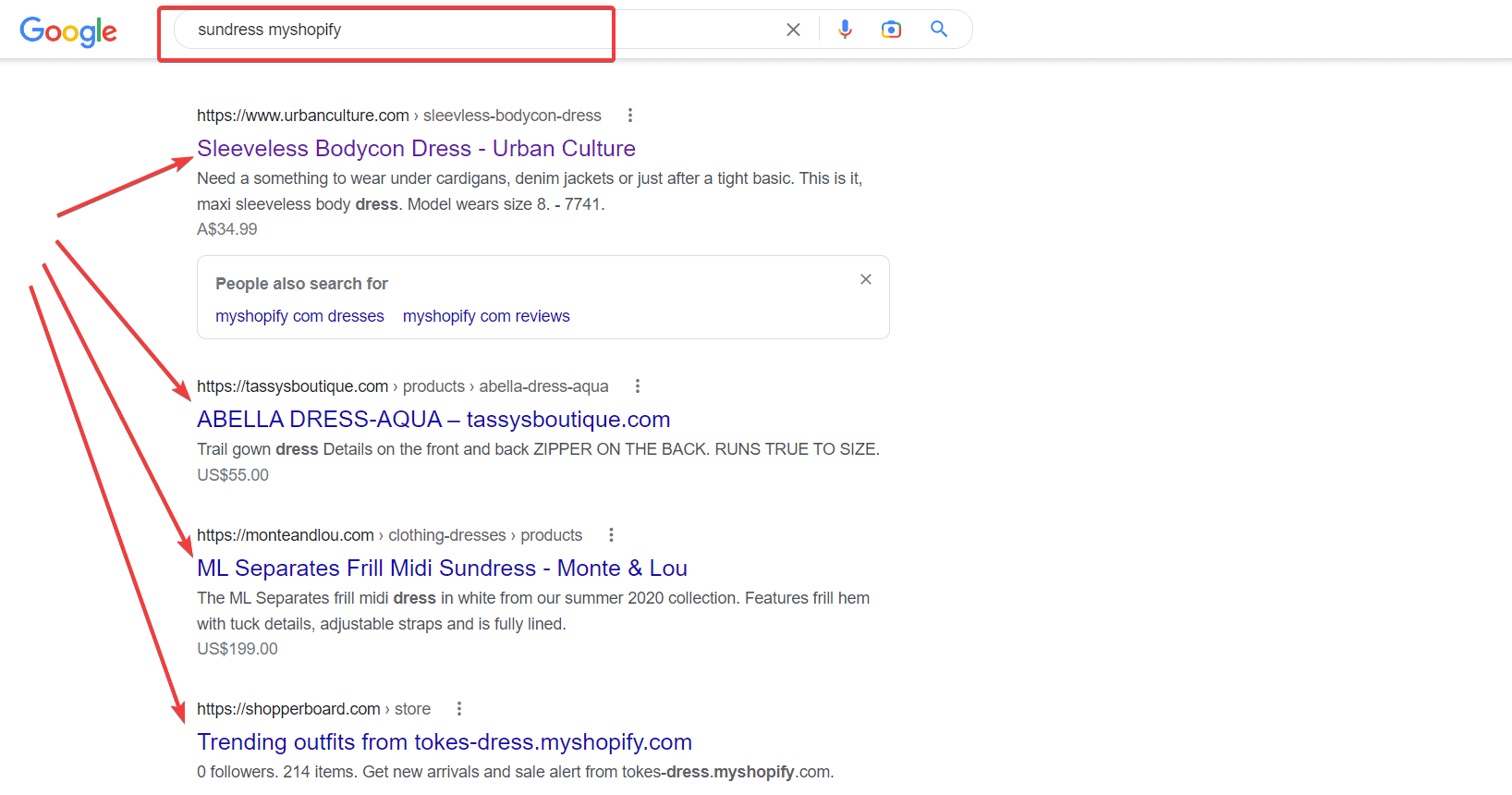 For example, to find stores selling sundresses, enter “sundress myshopify” into Google.