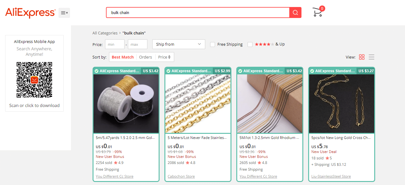 Bulk chains come in raw form and usually cost less. For instance, you can buy a 2-meter length of raw chain on Aliexpress for just $0.01.