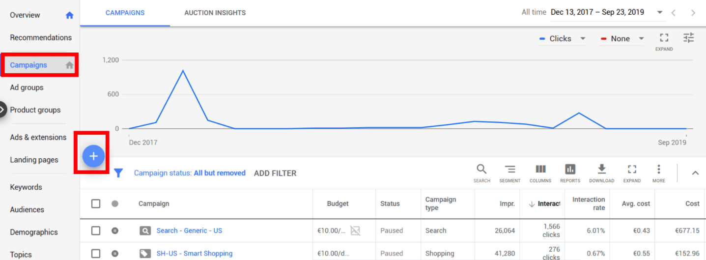 Once your products have been approved, you are now ready to create your ad campaign. Go to your Google Ads dashboard and click on the plus sign on the “Campaigns” tab and then select “New Campaign.”
