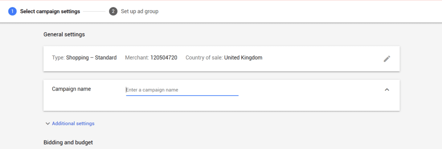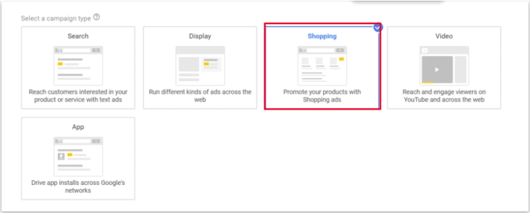 On the campaign type select “Shopping” and then fill out additional settings such as budget, the locations you want to show the ads, and other general settings.