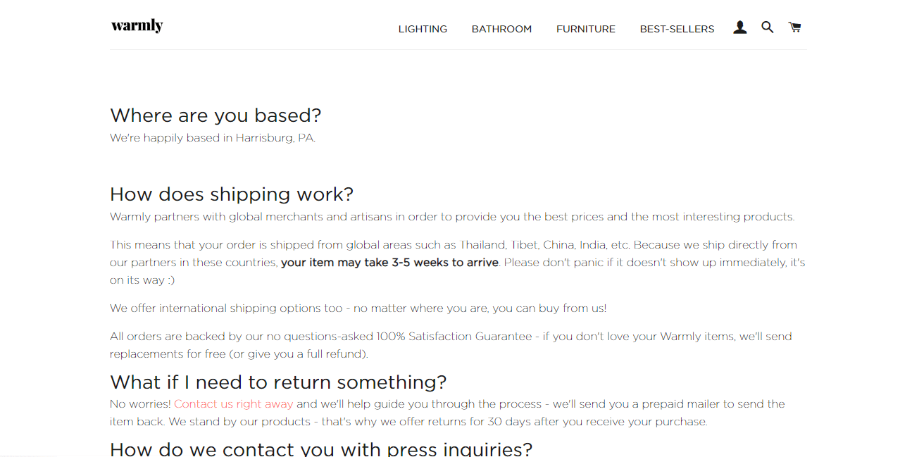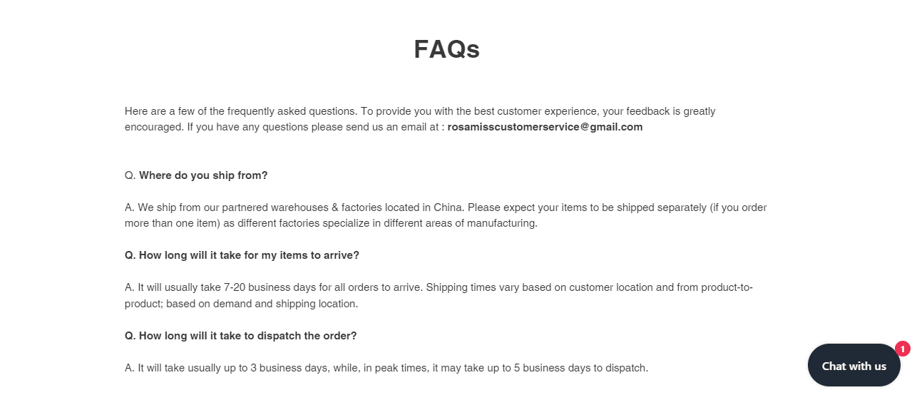 Did you notice how Rosamiss started with the most common question shoppers tend to ask: where do you ship from? You can take a cue from that when designing your FAQ page. Keep it simple and sweet.