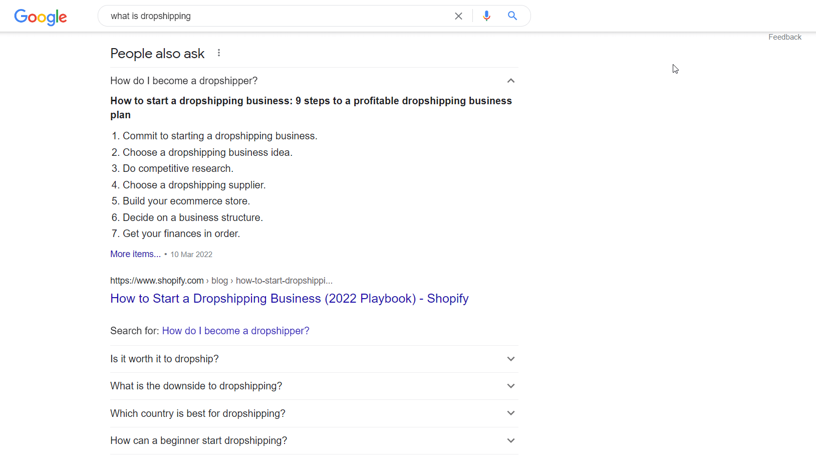 Head over to Google and search for “what is dropshipping”. After the page loads, scroll down to the People also ask section. There, you will see some common questions people ask Google about dropshipping.